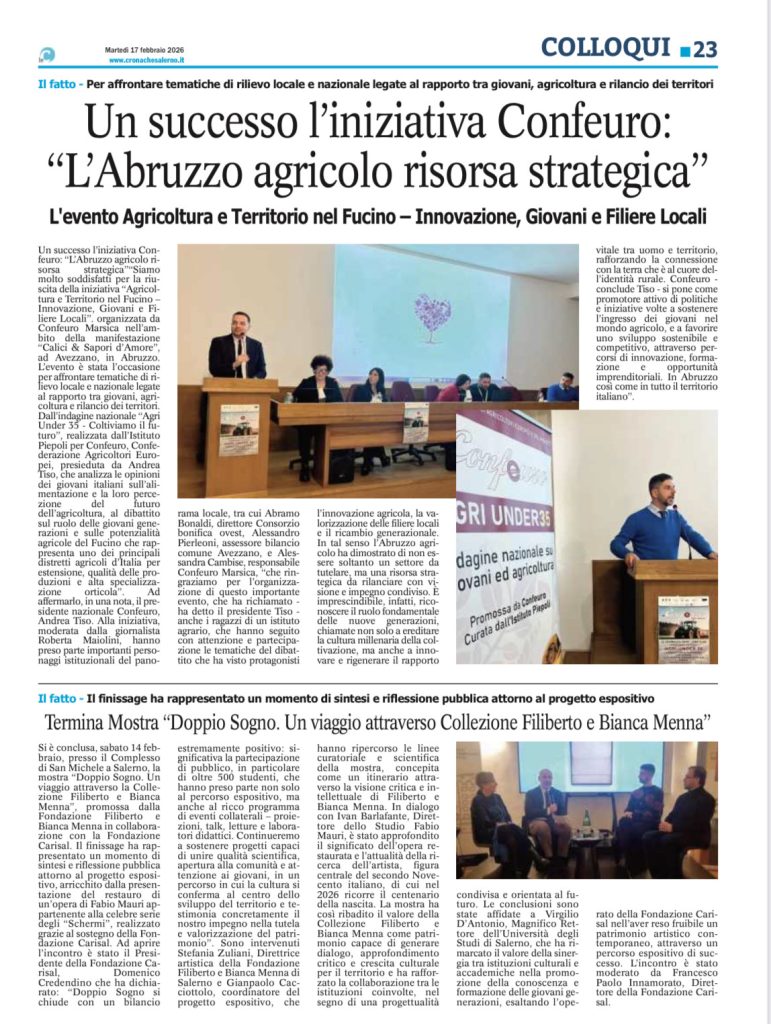 (ASI)“Siamo molto soddisfatti per la riuscita della iniziativa “Agricoltura e Territorio nel Fucino – Innovazione, Giovani e Filiere Locali”. organizzata da Confeuro Marsica nell’ambito della manifestazione “Calici & Sapori d’Amore”, ad Avezzano, in Abruzzo. L’evento è stata l’occasione per affrontare tematiche di rilievo locale e nazionale legate al rapporto tra giovani, agricoltura e rilancio dei territori.