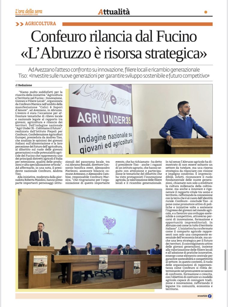 “Siamo molto soddisfatti per la riuscita della iniziativa “Agricoltura e Territorio nel Fucino – Innovazione, Giovani e Filiere Locali”. organizzata da Confeuro Marsica nell’ambito della manifestazione “Calici & Sapori d’Amore”, ad Avezzano, in Abruzzo. L’evento è stata l’occasione per affrontare tematiche di rilievo locale e nazionale legate al rapporto tra giovani, agricoltura e rilancio dei territori. Dall’indagine nazionale “Agri Under 35 – Coltiviamo il futuro”, realizzata dall’Istituto Piepoli per Confeuro, Confederazione Agricoltori Europei, presieduta da Andrea Tiso, che analizza le opinioni dei giovani italiani sull’alimentazione e la loro percezione del futuro dell’agricoltura, al dibattito sul ruolo delle giovani generazioni e sulle potenzialità agricole del Fucino che rappresenta uno dei principali distretti agricoli d’Italia per estensione, qualità delle produzioni e alta specializzazione orticola”.